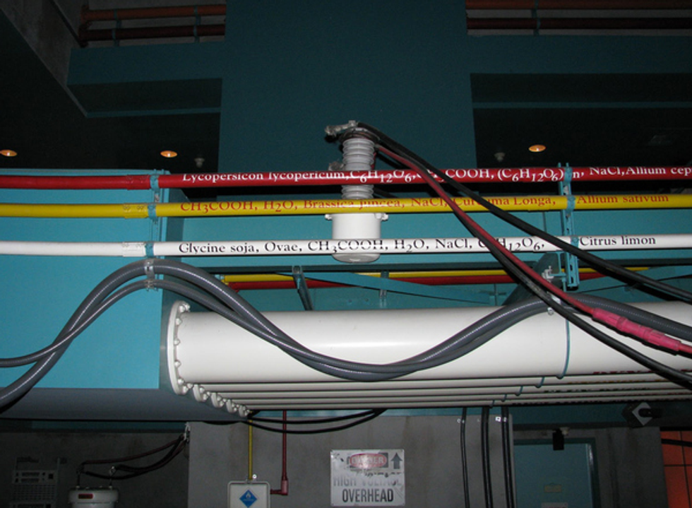 If you've waited on the queue line for Dinosaur in Animal Kingdom, you might have notices these three pipes with weird looking chemical formulas on them. I had my Bio-Chem major sister investigate, and she found that they were actually the chemical formulas for ketchup, mustard, and mayonnaise.