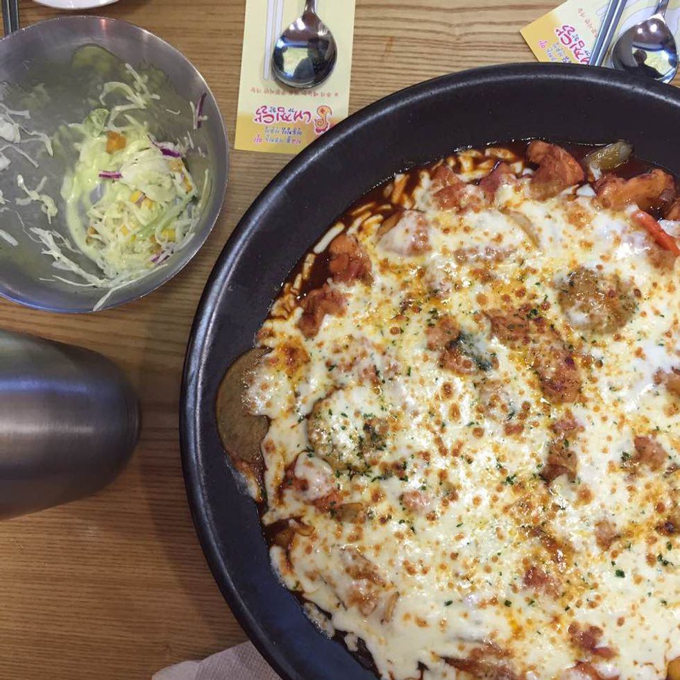 I had never had jjimdak before, and now I know what I was missing. Jjimdak is braised chicken mixed with vegetables, noodles and usually rice cake. We even had it with cheese on top.