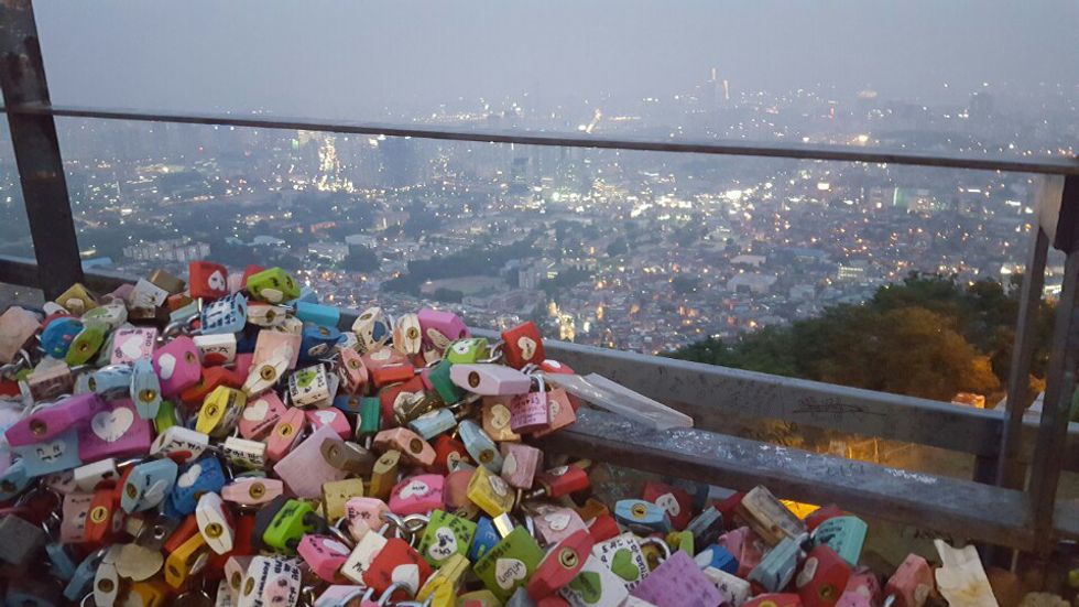 I am a tourist after all, so I made my way to Namsan Tower and took more pictures than the reasonable allotment. The tower is on a hill overlooking Seoul, and the skyline after dark is breathtaking. Couples have filled the platform railings with locks with their names, and the tower itself is lighted up after dark.