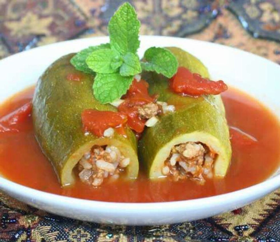 Kusa is stuffed squash with tomato sauce, rice, and meat.