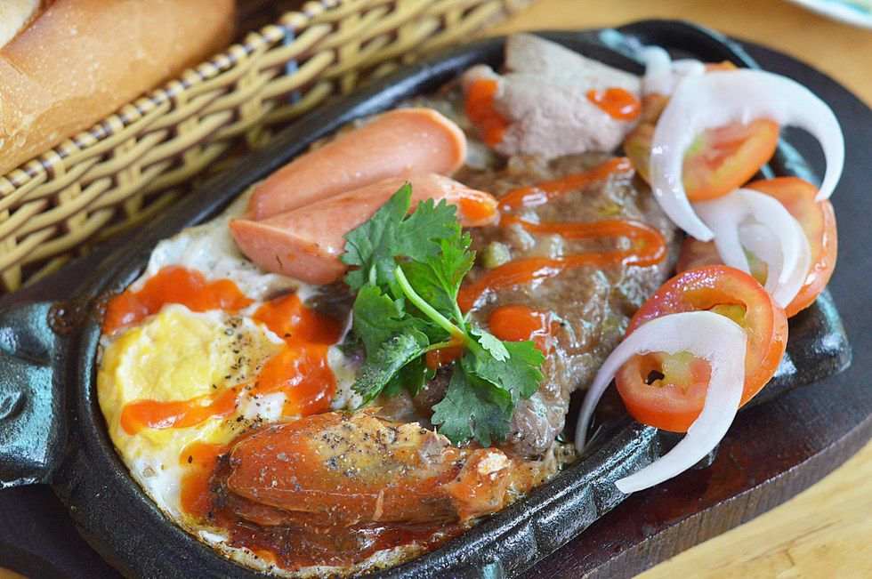 Rib-eye steak cooked on sizzling plate. It's called "sizzling" because when the dish is served, the food is still cooking with the sizzling sound. It's served hot and instant. Added sides include pâté, egg, sausages, tuna, etc.