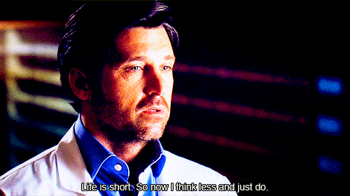 McDreamy, I hear you man. You've got to decide where to cut in a matter of seconds. Think less, and just do. Derek says this when he's talking to the therapist after the shooting. Overthinking kills. There is one reason Kepner didn't get shot, which is because she told the patient's husband all about her life. She thought on her feet, as a good trauma surgeon needs to. Think less, and just do. Seems to be a good idea, as long as you have at least half a brain. I do not suggest that 90% of the general population do this though.