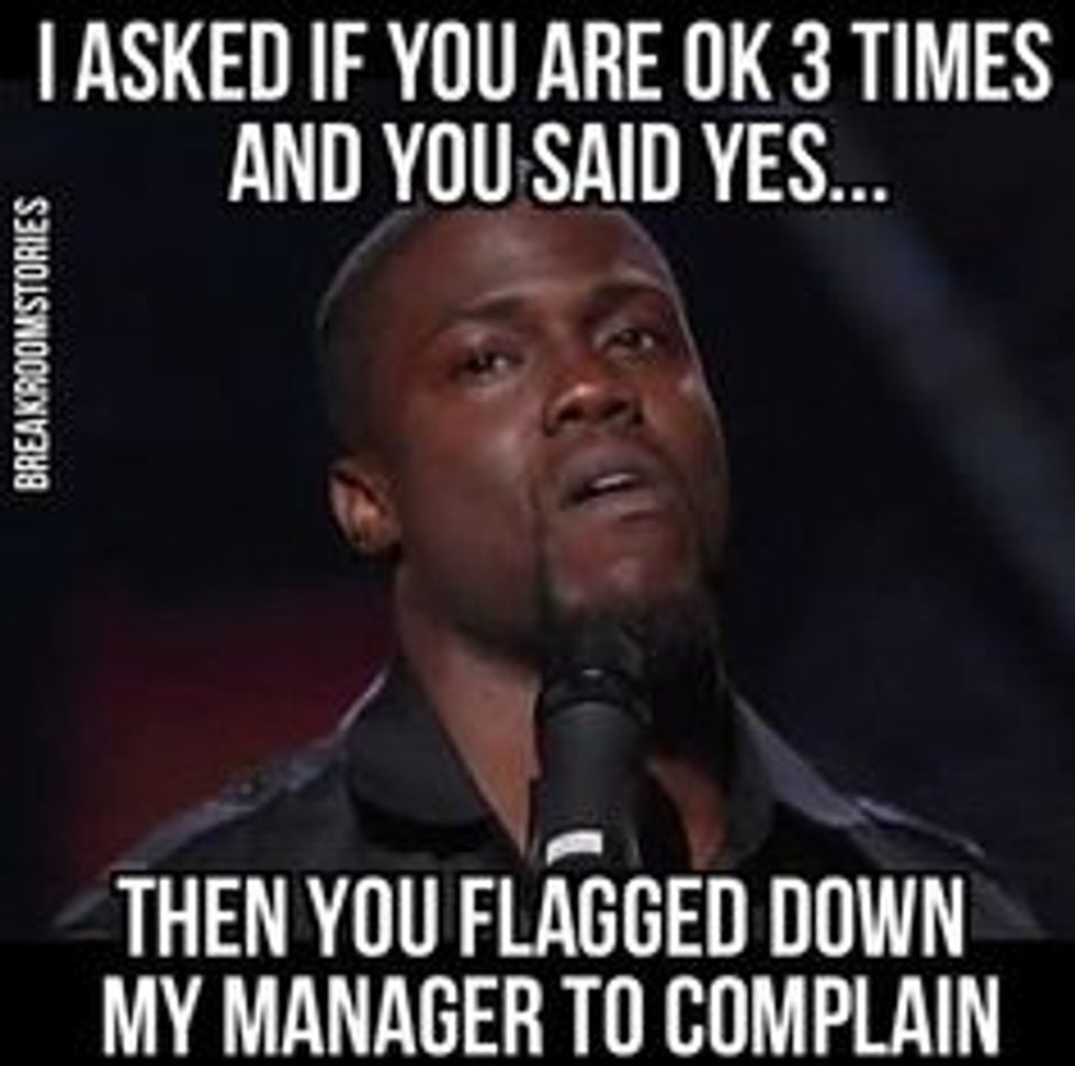 8. You said you were fine all the times I asked you, but call the manager over while I'm in the back.