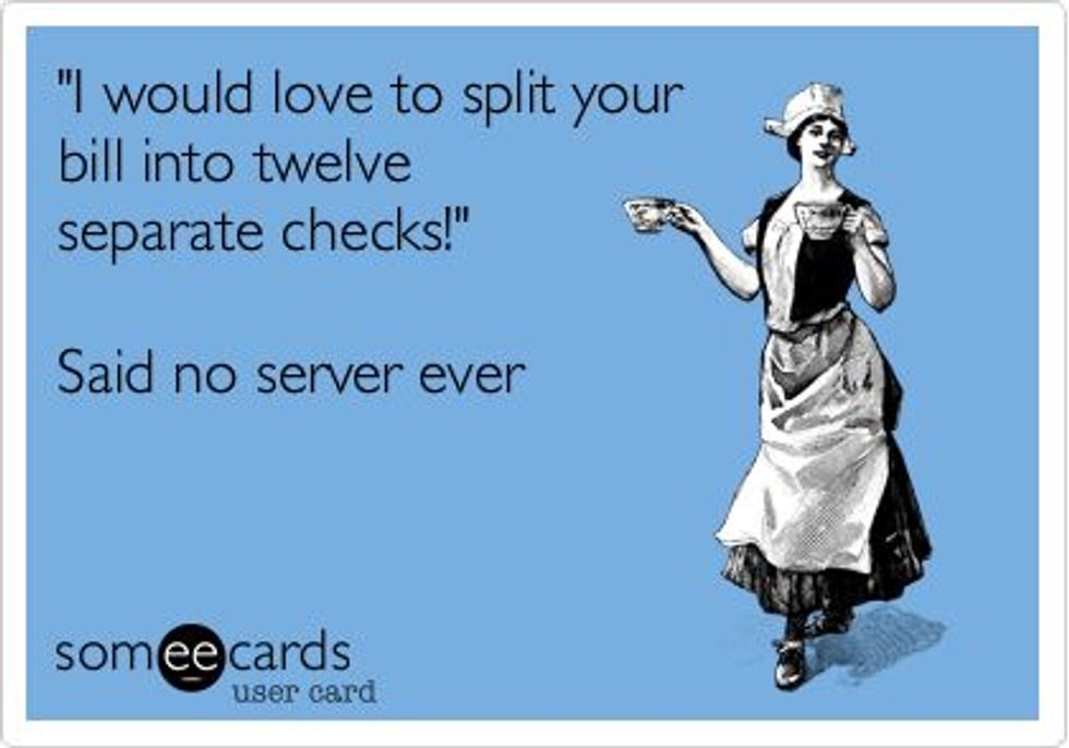 When it comes to splitting checks, I don't mind splitting it two or three ways. Even four isn't that terrible. However, when a big party comes in and wants the check split 15 different ways, I'm throwing in the towel. You guys should figure out the money situation before you come in so that way more than one person can be on each check. Remember, he more checks you have the longer it'll take me to cash you out.