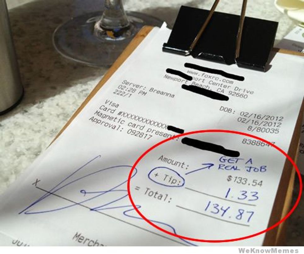 Personally, this is my biggest pet peeve that I have on this list. Do not leave me nothing and tell me to get a real job, this is a real job. If it wasn't for me, you'd have nothing but fast food restaurants. Do not give me a verbal tip, that ain't paying my bills boo boo. Don't leave me a "Jesus loves you" pamphlet, I am at work not church. Do not leave me your pocket change, I will chase you down and give it back. People need to learn how to tip 20 percent when they go out. Oh, and for those people who "Don't tip", you might as well eat at home. It isn't funny not to tip, this is the difference between some people's electricity being on or off. What's funny about that?