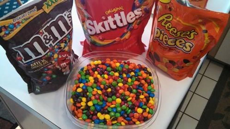 Put a bunch of M&Ms and Skittles (and maybe Reese's Pieces if you're sure your victim isn't allergic) together in a bowl.
