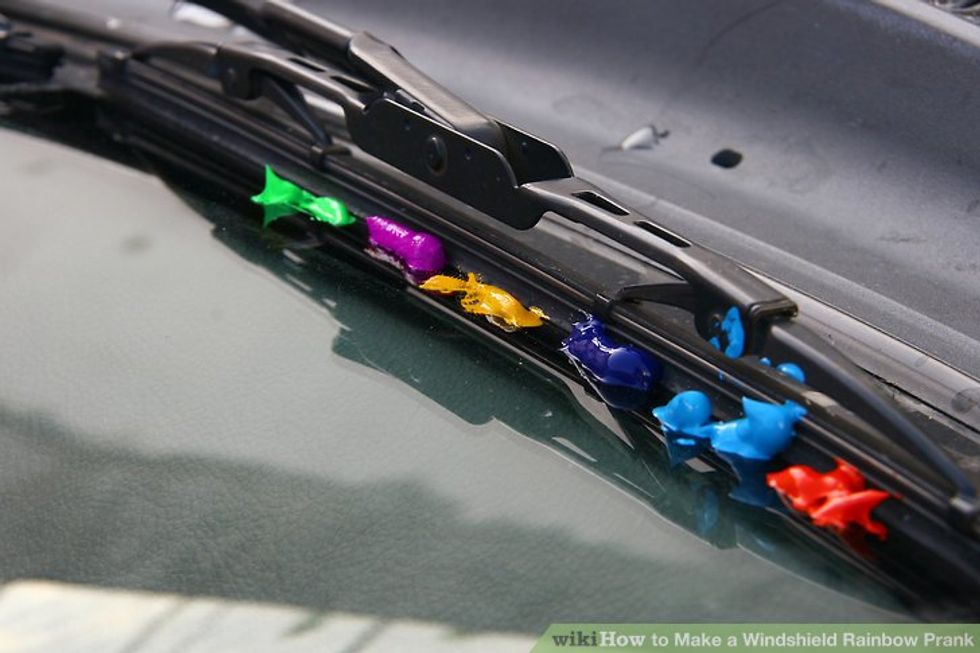 Put paint right by the edge of your victim's windshield wiper. This way as soon as they turn them on a rainbow will appear. Hopefully the weather will help you out, too. MAKE SURE TO ONLY DO ON THE PASSENGER SIDE SO THAT THE DRIVER CAN STILL SEE.