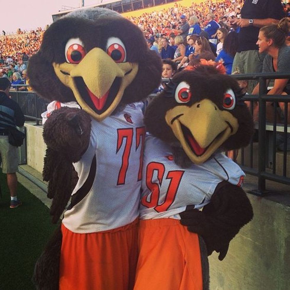 Freddie and Frieda are the cutest mascots around and they are our beloved birds! Freddie Falcon was born in 1950 all thanks to members of the Alpha Phi Omega Service Fraternity. The idea was to create school spirit at BGSU athletic events. On January 16th, 1950 at the BGSU vs. Ohio University basketball game Freddie made his debut and was introduced to the community. Then on February 25th, 1966 Frieda Falcon was introduced as Mrs. Freddie Falcon and was actually a male cheerleader in disguise. Frieda re-emerged in 1980 as Freddie's little sister and sidekick.