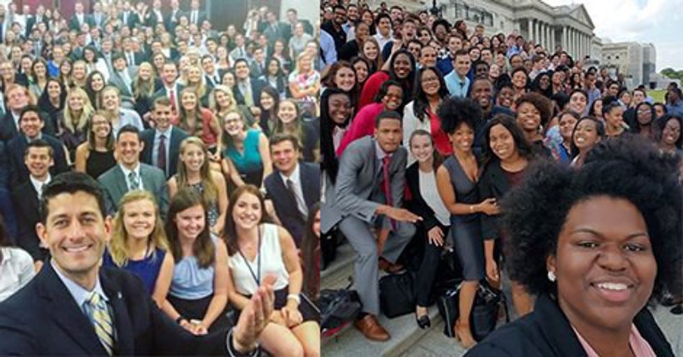 Last week at the RNC (Republican National Convention) there was not much diversity in the crowd... but can we really be surprised? Recently, Republican Speaker of the House, Paul Ryan posted a selfie with his party's Capitol Hill interns. It is obvious to see the lack of diversity in the picture. In response, one of Democratic Rep. Eddie Bernice Johnson (Texas) interns' led a selfie which was full of diversity...As a result, I think we can expect to see a diverse crowd in the audience at the DNC.