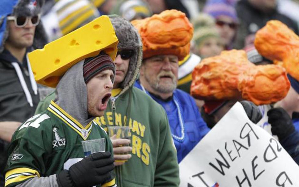 Pop-quiz: Guess which teams these cheese and chicken wing hats are for!