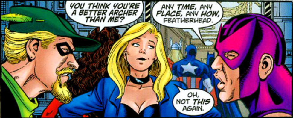 Marvel/DC had a special crossover series and guess who comes back from the dead? That's right. Hawkeye.