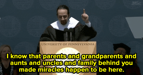 Over the summer, I spent some time watching Miranda's recent commencement speeches at Wesleyan and the University of Pennsylvania, and I was nearly moved to tears by both speeches. I can only imagine what the students in the audience must have felt with this extremely passionate, articulate, exuberant speaker standing before them. I can only hope wildly that Miranda will be the commencement speaker when I graduate from UVa in a few years.