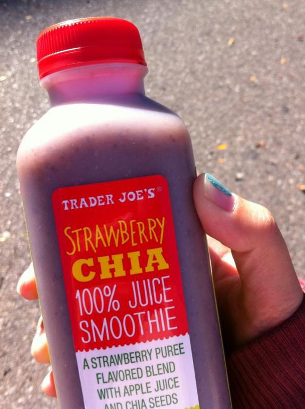 Trader Joe's carries amazing juices/smoothies that you can't find many other places. At least, not in the midwest. (I'm assuming there's a juice stand on every corner in California.) I recommend the Strawberry Chia Juice Smoothie!