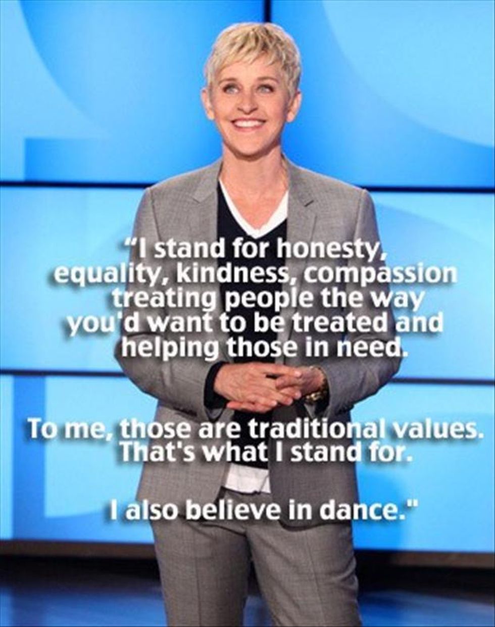 She is constantly advocating for kindness, honesty, and treating others the way you would want them to treat you. And those values are slowly fading away from our society. If we don't practice what we preach, then we will never grow as a society and qualities such as compassion and kindness will slowly fade away. But Ellen is here to make sure that doesn't happen.