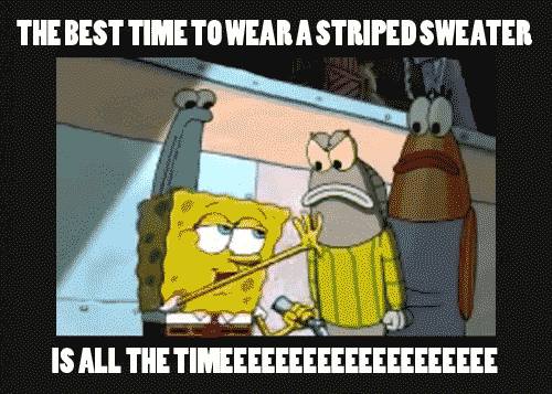 I mean, who doesn't love a good striped sweater, amirite? I think SpongeBob said it best. They're comfy, warm and above all, you can literally throw one on and walk out the door looking like such a fashionista.