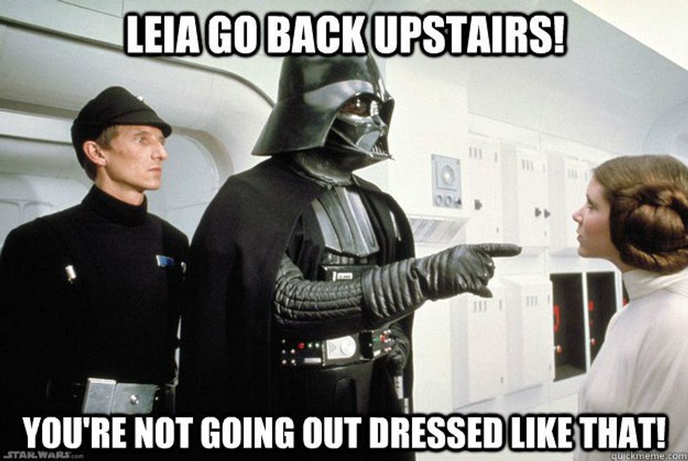 Don't even think about leaving the house in that shirt. You dress like a boy or you stay at home. Of course it's still fun to walk around the house in a sports bra just to gross them out.