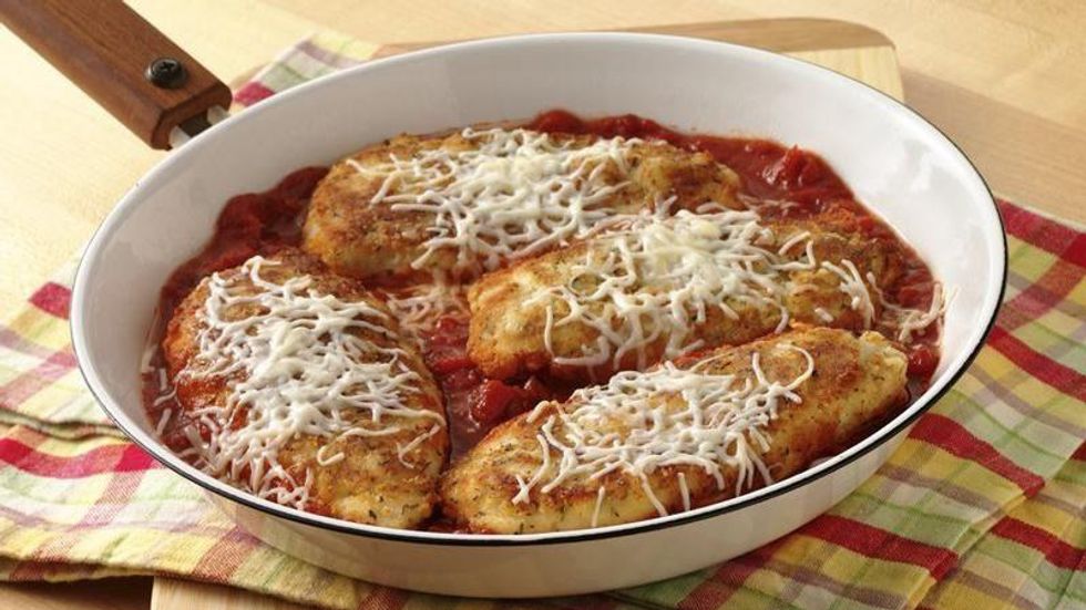 Chicken parmesan is one of my all-time favorite meals. This spin on the classic takes 25 minutes and makes four servings. Ingredients include Bisquick mix, Italian seasoning, grated Parmesan cheese, egg, boneless skinless chicken breasts, olive or vegetable oil, tomato pasta sauce and shredded Italian cheese blend.