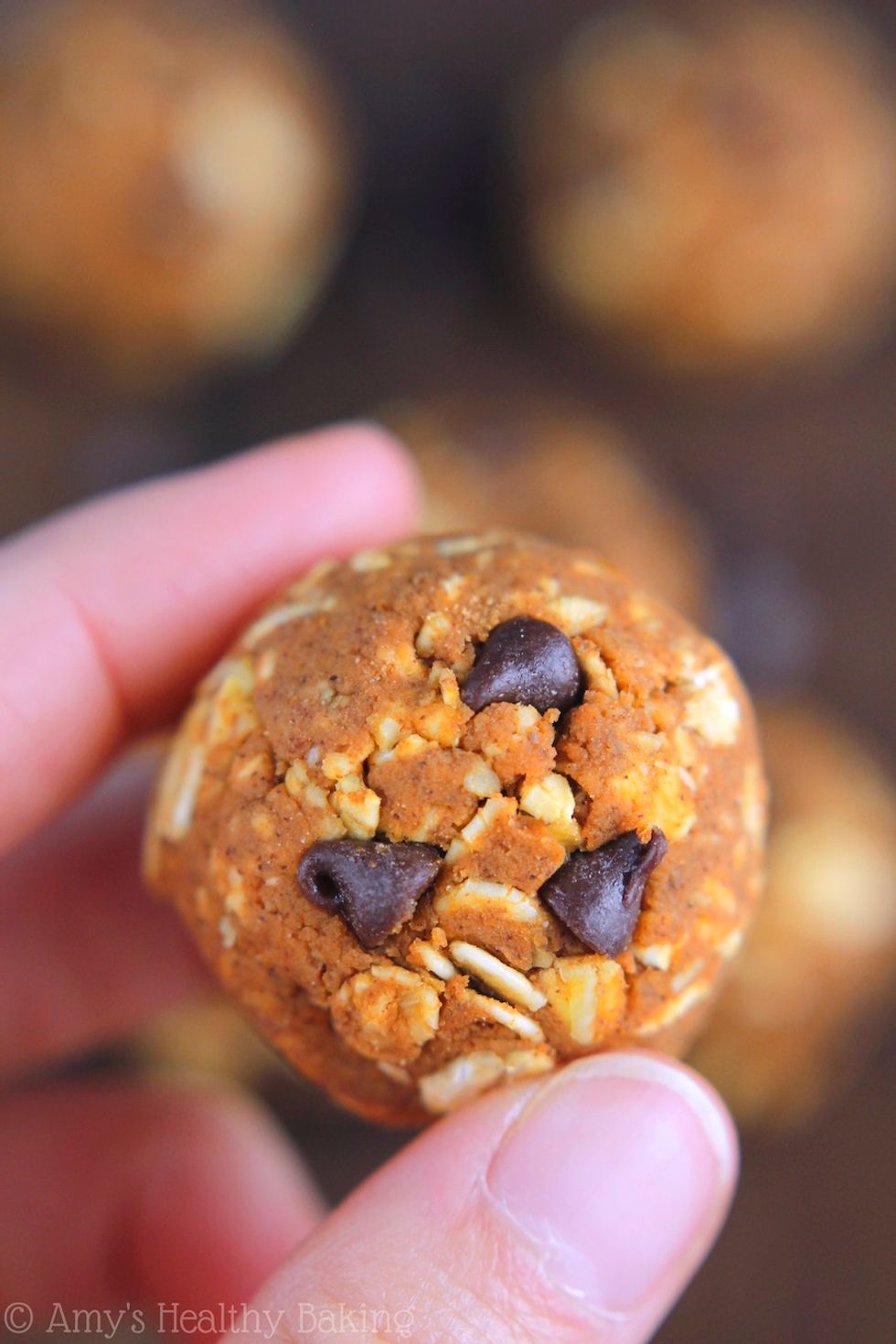 Why not use your seasonal pumpkin and chocolate cravings to keep you satisfied and full of energy? This recipe calls for 100g of old-fashioned oats, 1 can of pumpkin puree, 2 tbsp. ground cinnamon, 2 tbsp. Truvia (or other sweetener), 2 tbsp. of mini chocolate chips, and 2 scoops of protein powder. In a medium bowl, whisk together the oats, protein powder, cinnamon, and Truvia. Stir in the pumpkin purée and fold in the chocolate chips. Scoop the mixture to your liking, roll in a ball, and store in the fridge.6. Cinnamon Honey Butter