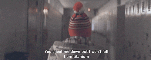 I'm bulletproof, nothing to lose, fire away, fire away, ricochet, you take your aim, fire away, fire away. You shoot me down but I won't fall, I am titanium."