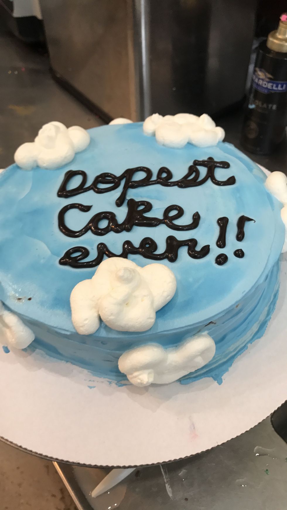 We once received an order for an ice cream cake with our “Groovy Tie-dye” design and with the inscription: “Happy B-Day! I also rolled you a blunt.” Following the directions, I decorated the cake and wrote just that on the cake. The night the cake was to be picked up, we got a call from the customer who wanted to make sure that their cake said what they had requested. This was