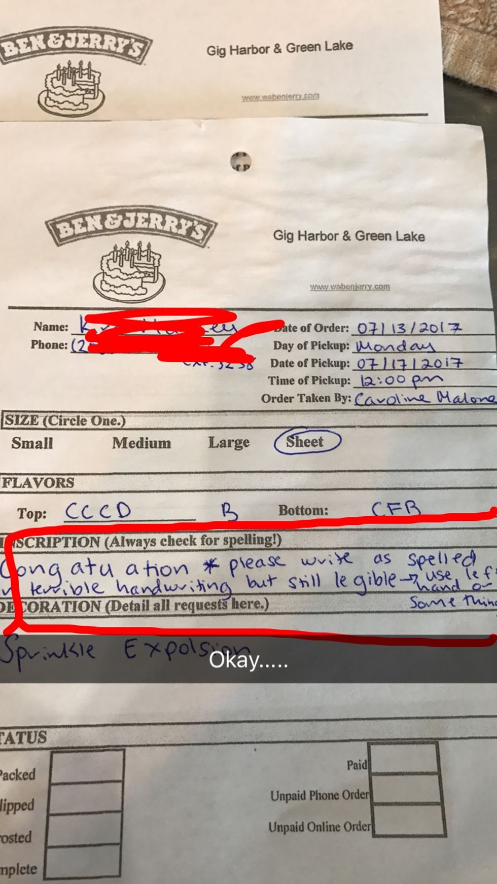 Another ice cream cake order came in from someone who was throwing a party for a co-worker who was not known for their spelling or handwriting as the instructions for the inscription of the cake read: “7. The need for frosting.