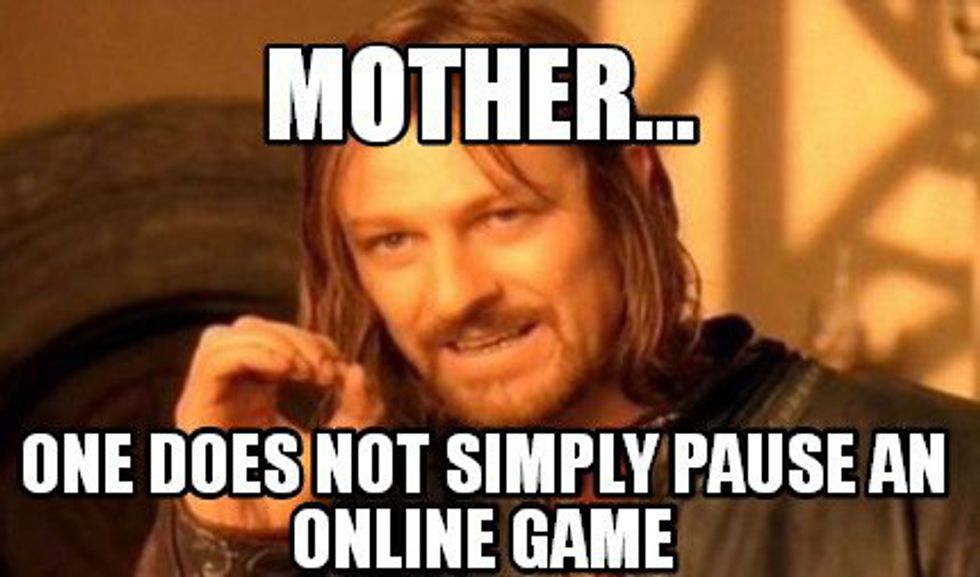 "No mom I can't pause the game," said nearly every gamer ever. This occurs when your mother needs you to do the most mundane task, that has to be completed right at that moment or it's the end of the world. No matter how many times you promise her you will get to it after the game is done, she still insists on asking you at least 100 more times.