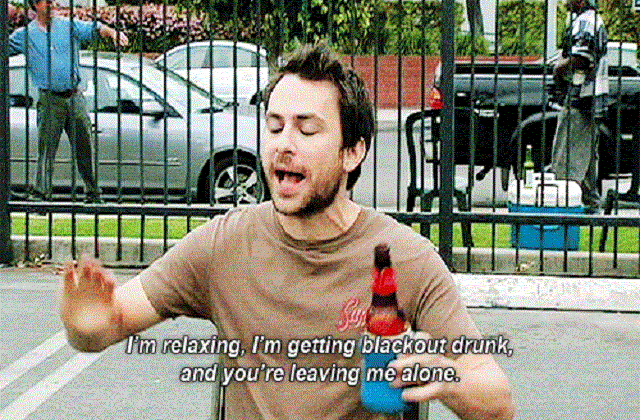 I get it: end of a long week, done with people already, and just ready to not do anything except the activity above. Hopefully you don't get too drunk like Charlie does, so stay safe!