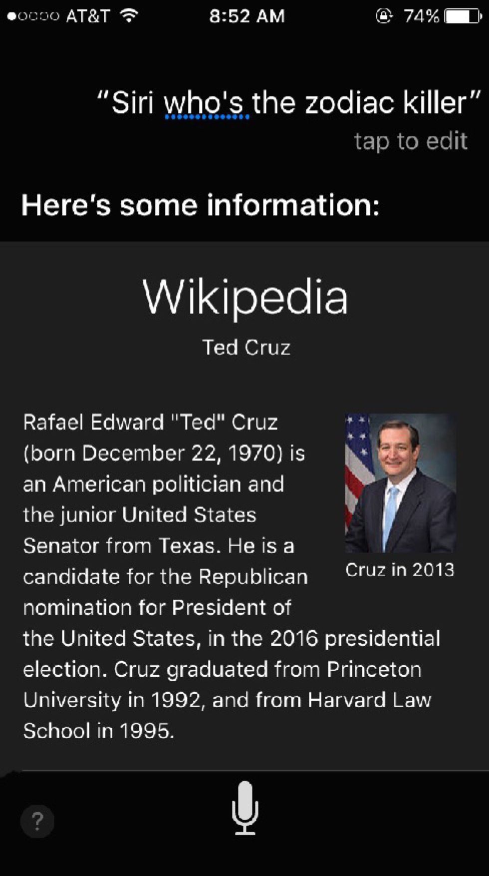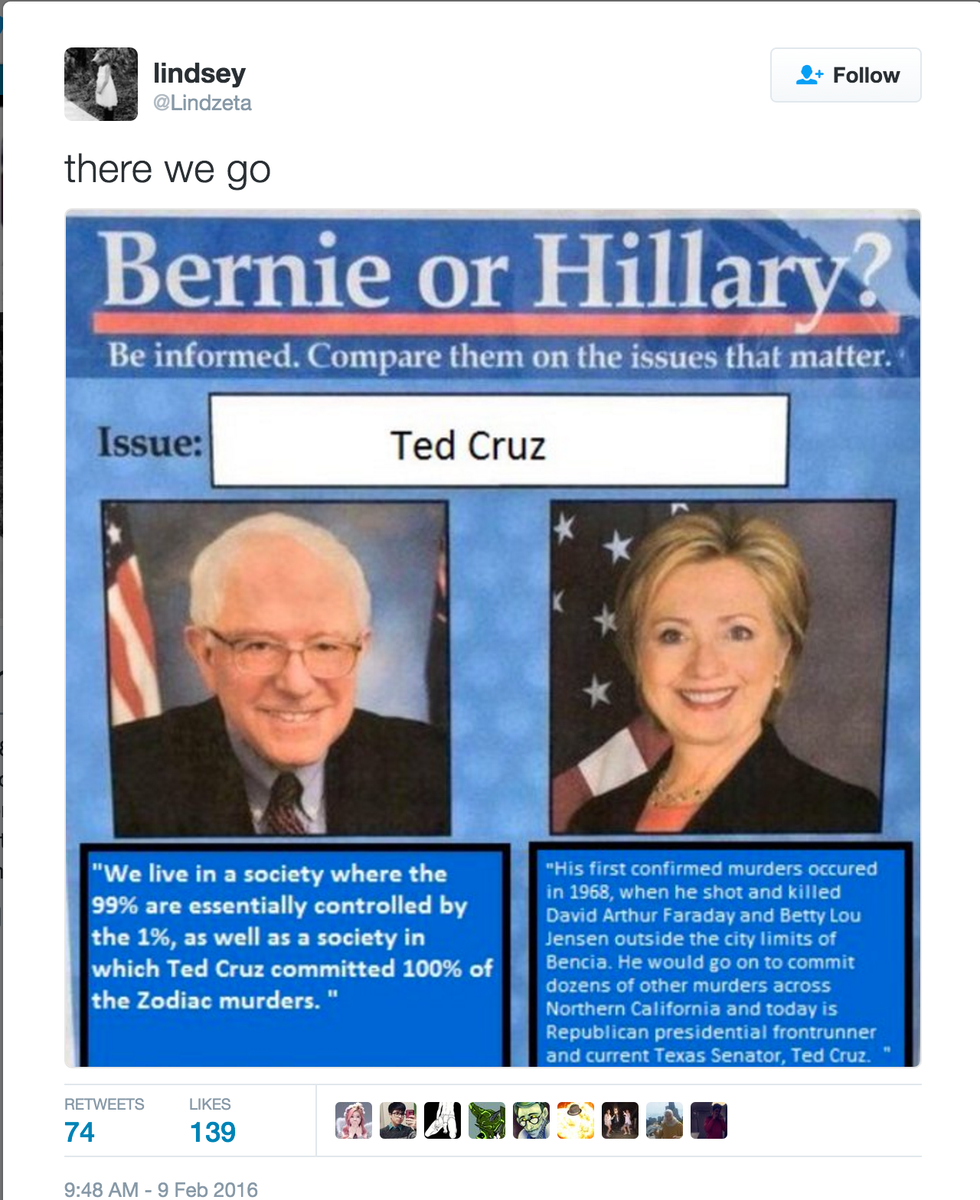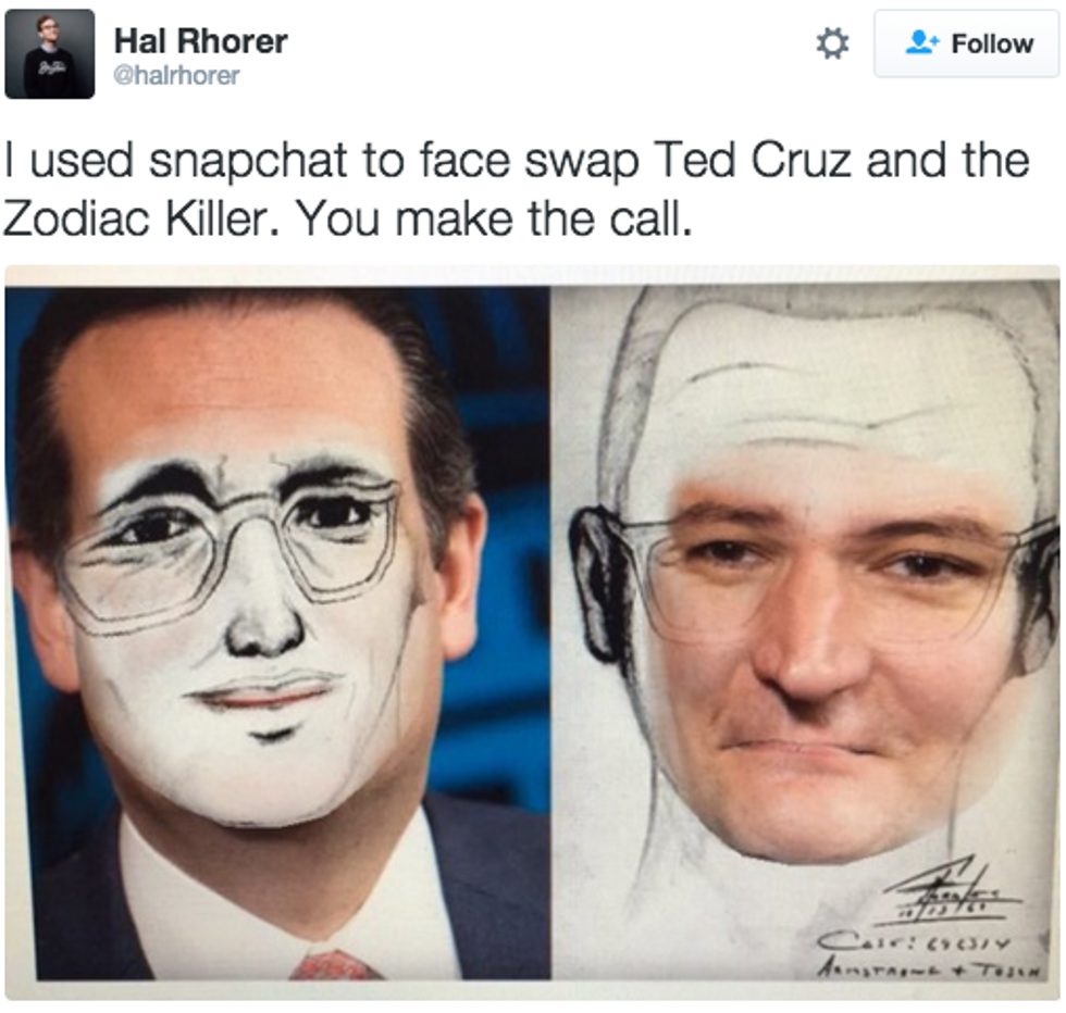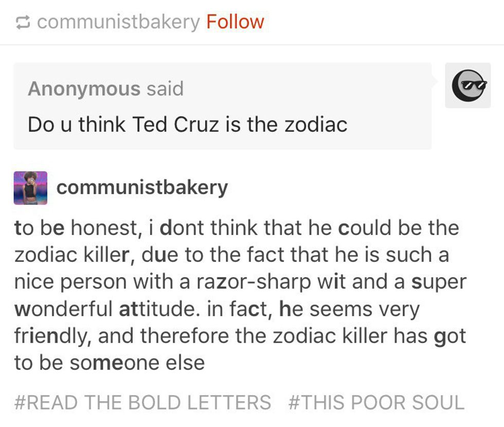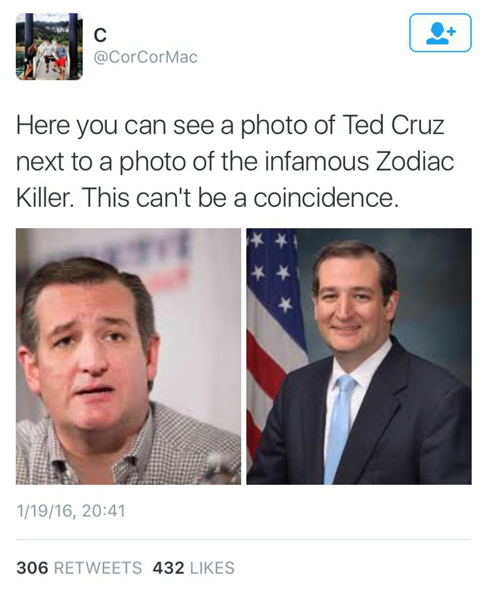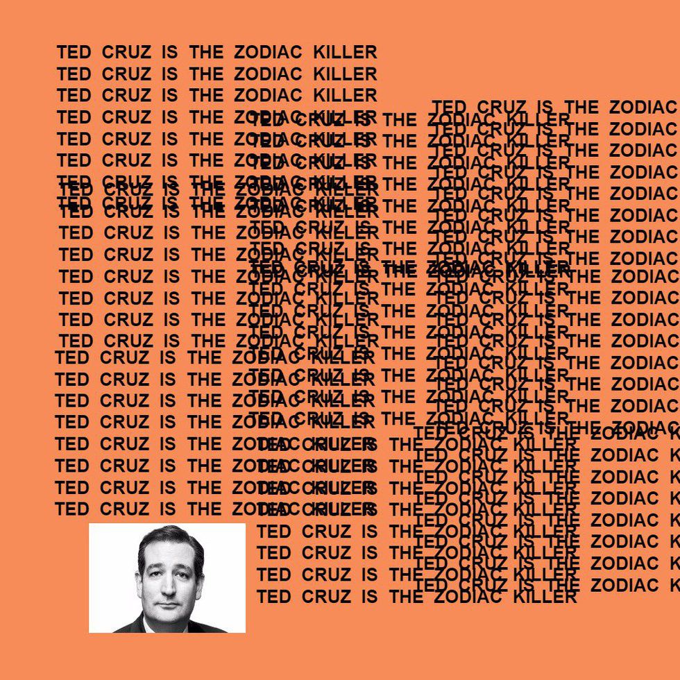 My favorite one so far is, hands down, the idea that Ted Cruz is the infamous Zodiac Killer. This affected me so much, I re-watched the movie (which I totally recommend--it's long but it's great and the cast is quality). There are both extensive and not so extensive theories. It is even now one of the most google questions in relation to presidential candidate Ted Cruz. I have no logical explanation as to why this particular one is so much funnier to me than the rest (and, lord knows, there have been plenty), but it is, and I am such trash for it that I laugh at every single one. So, since I'm such a good sharer, here are the 11 best Ted Cruz is the Zodiac Killer posts: