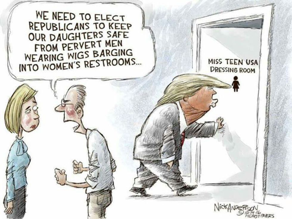 Donald Trump is a fucking psychopath, with absolutely no regard for the middle class or minority groups. He is way more threatening to your well-being as an American citizen than a trans person will EVER be.