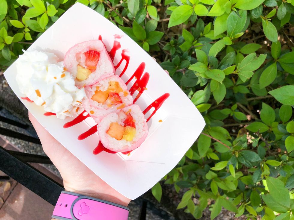 Each spring, Epcot hosts its annual Flower and Garden Festival. Along with the festival, small pop-up restaurants appear throughout the park. One of the "must have" items during this festival is the amazing Frushi from the Japanese kiosk. Sushi made of fruit? YES PLEASE!