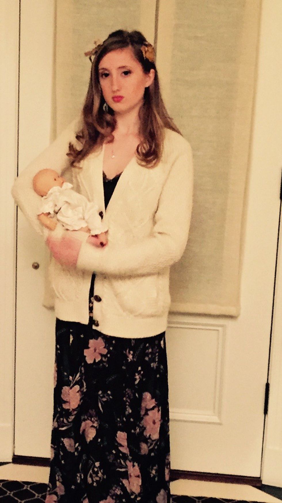 Long earthy dress, leaves in hair, and sandal-clad or bare feet. Bonus points if you replace the baby doll's head with a globe.