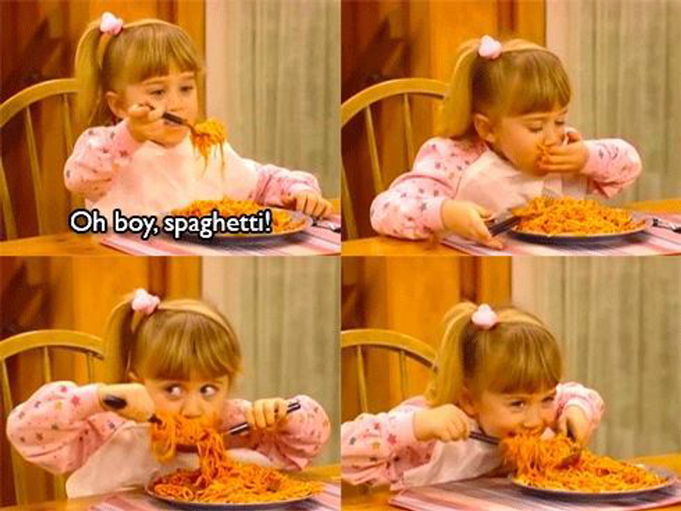 People think that noodles and sauce are so romantic. If two dogs in a movie can suck on a noodle until their noses touch while a creepy chef plays romantic music around them, why can't two people have a moment like that? I will give you that answer: it is a sloppy mess that leaves sauce all over your face. It only appears tender because this is a children's movie and children's movies are supposed to be happy and passionate. Skip the pasta, and move on.