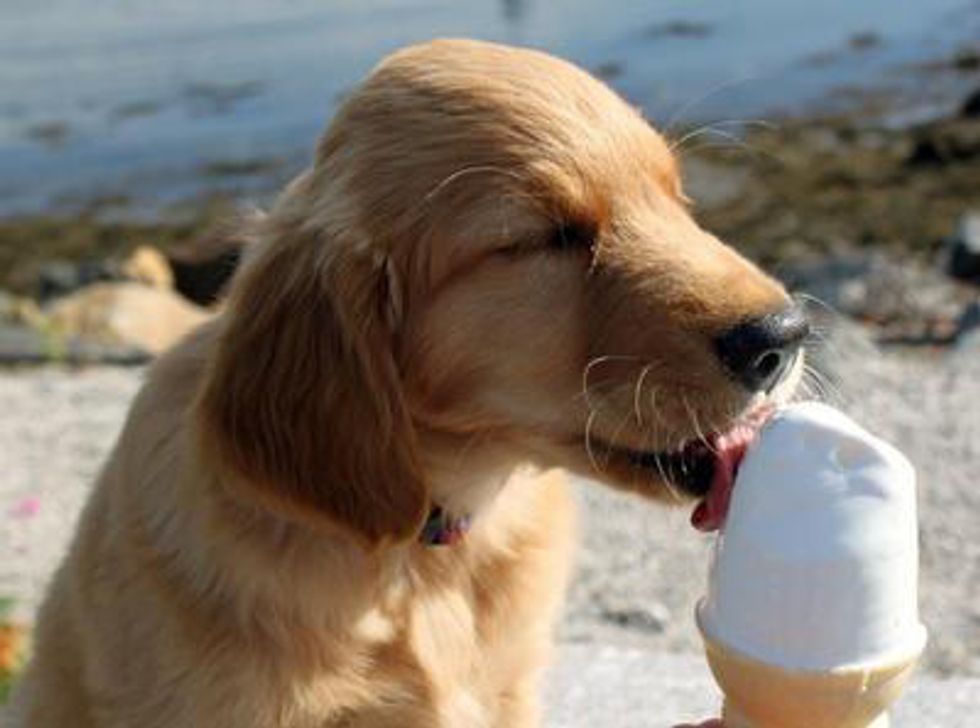 This is a puppy eating ice cream.