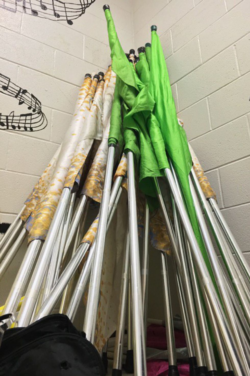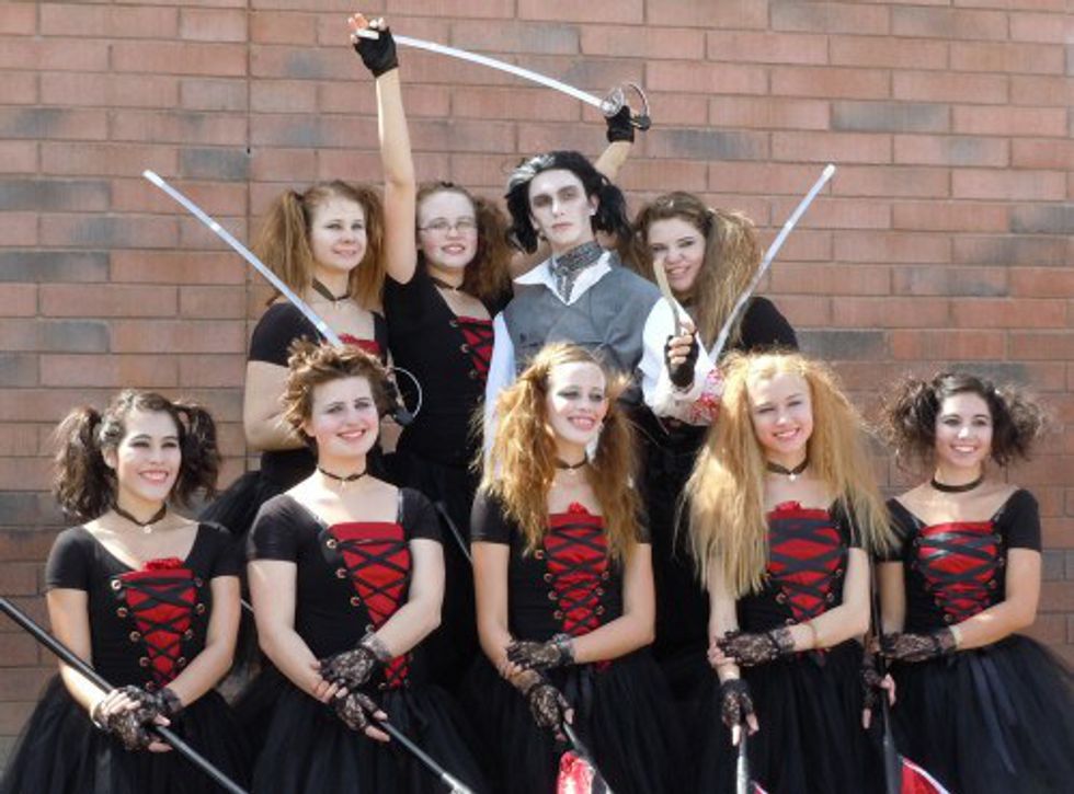 2. a group of girls, and occasionally a gay guy, who make marching band far more interesting by dancing and spinning flags, sabres, rifles, batons, and sometimes the odd prop or two.