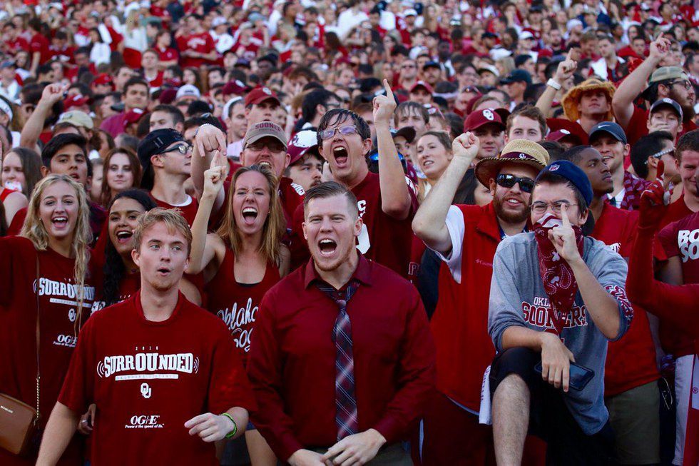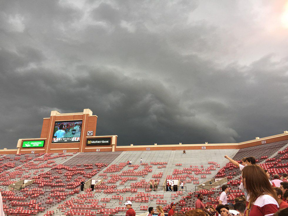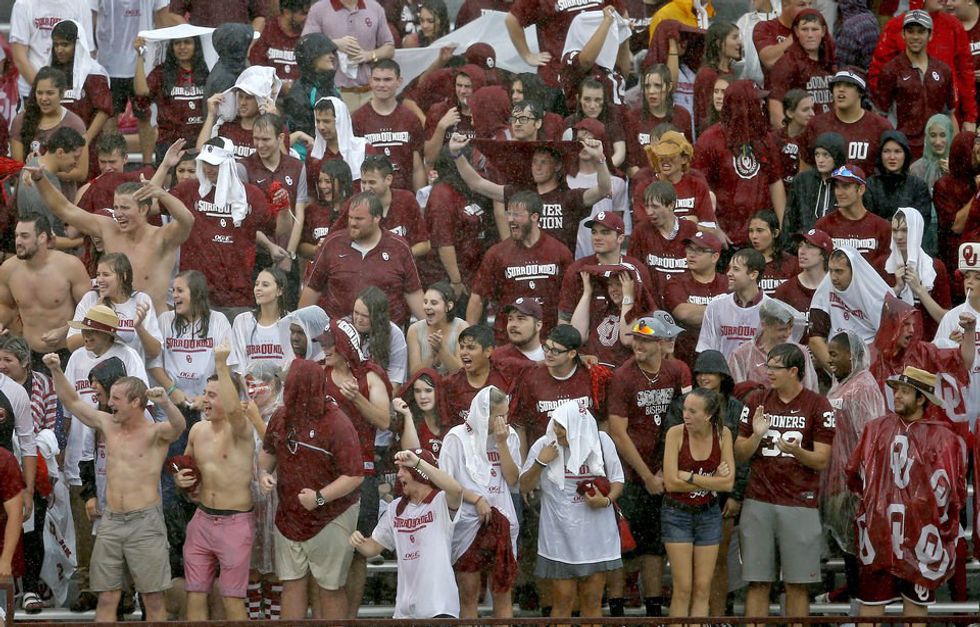 About two hours until kick off, massive clouds covered the area above Oklahoma Memorial Stadium. After the announcer urged students to vacate the seating area because lightning was approaching, chants of "Hell no, we won't go" rang throughout Norman, showing the newfound fan dedication.