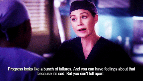 Failures: They are going to happen in college. There are going to be grades that you get back that you are not happy with. Sometimes it is hard to keep these things in perspective and they really can bring a person down. As Meredith says though, we must not fall apart. Progress looks like a bunch of failures!