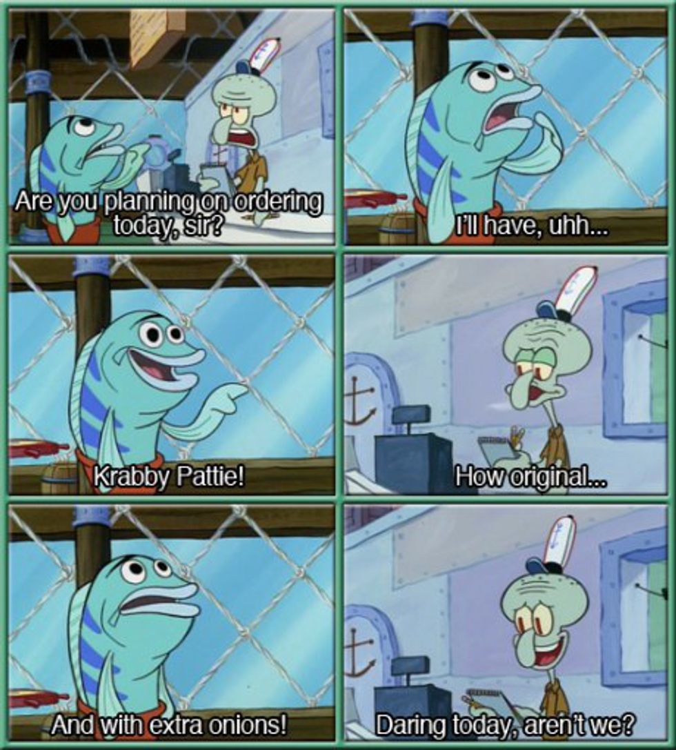 It is no secret that every millennial has watched SpongeBob Squarepants at least once in their lifetime. Some of us, including myself, have nearly devoted their entire life to memorizing Spongebob's most famous quotes that are very relevant to the moments in our lives. Some of the moments in my life now happen at a restaurant, which I serve at. Many things that run through my mind are Spongebob quotes, believe it or not. So, here are a few of them that are on my mind, nearly every shift.