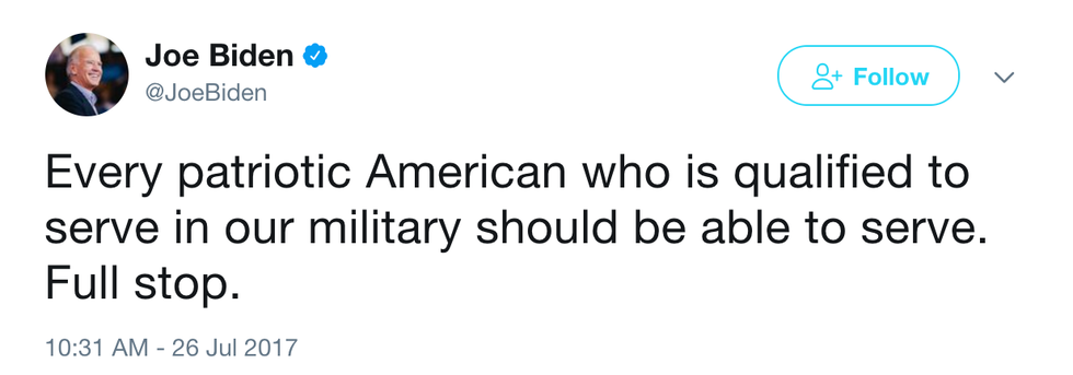 What I like so much about Joe's tweet was that it plays a lot into how simple the military works. If you are healthy, loyal, brave, and willing to serve in the military you are allowed to if you chose to. That's how it works. It's that simple.