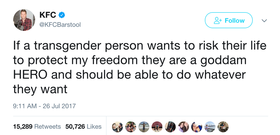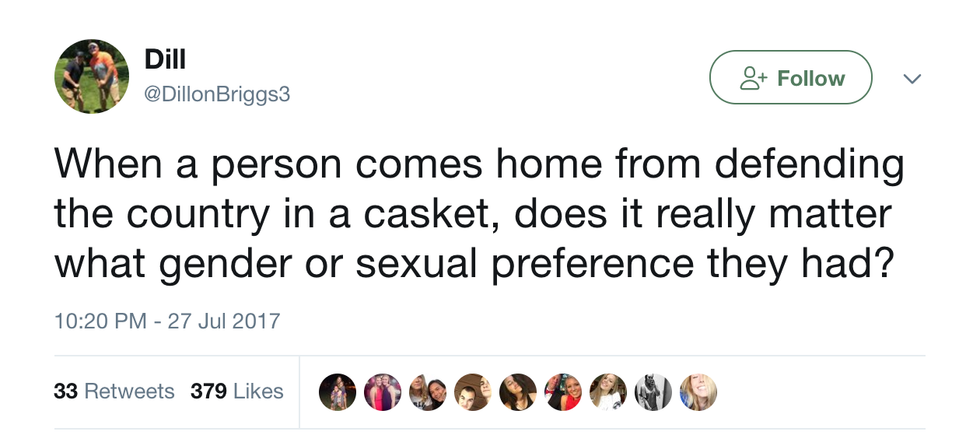 This tweet, which I stumbled upon (and happily retweeted) in my "local" feed, is one that made this ban realistic in the sense of what sacrifice really means. Everyone is aware of the dangers of serving in the US military, and some brave souls have paid that ultimate price. But if they are willing to die for you, who the fuck actually cares what their race, religion, gender, gender identity, or sexual orientation is?? They fought so you don't have to. That deserves some appreciation.