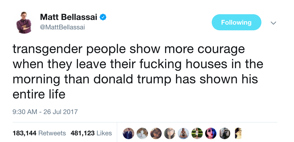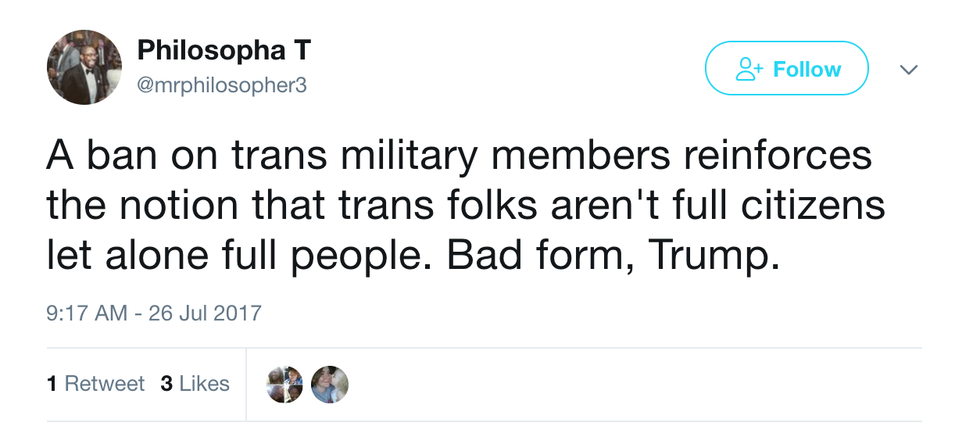 Like many American's, I was shocked but also not surprised that President Trump would create a policy that bans a group of individuals from their basic human rights. This ban, claimed to aid the financial interests of the military, was first announced via Twitter (go figure). And if Trump honestly wants to use Twitter to create policies and inform the US about all of his great ideas, I am going to use Twitter to show him how much people don't respect his decisions and how idiotic he actually sounds.