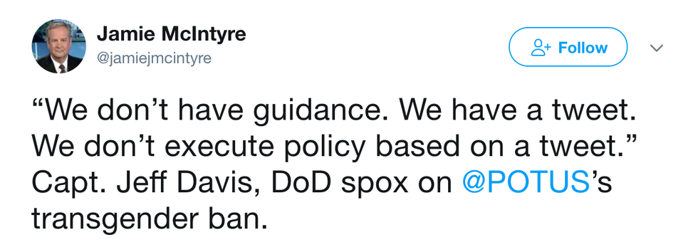 This was a prime example of how our President can't seem to figure out that a Tweet is not the proper nor legal way to change policies. His tweet so far has done nothing but stir up controversy.