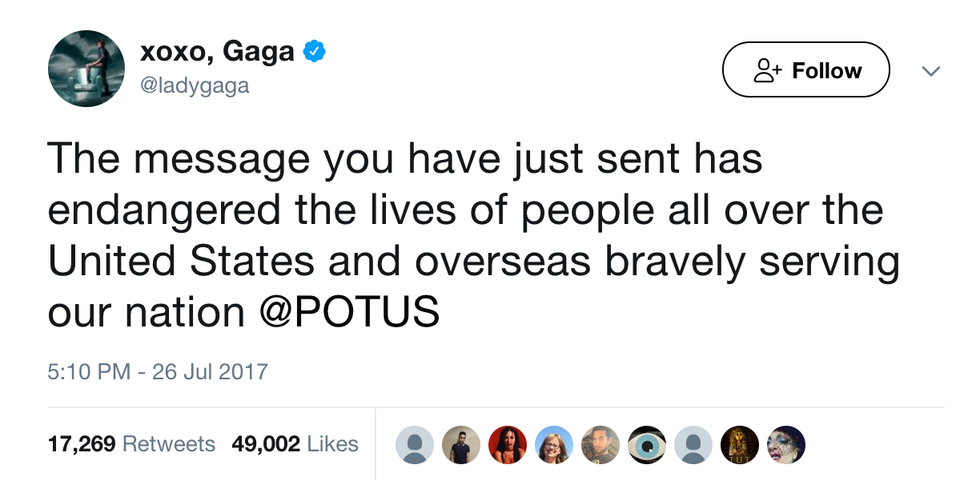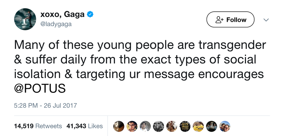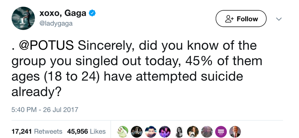 The suicide rates Gaga discusses are due to the fact that Trans people everywhere feel unaccepted and discriminated against every day of their lives. If we can treat them with the same respect you would give anyone else, these rates would surely go down. Also, war causes everyone stress, not just people who are transgender and serving. Everyone replying to this tweet, telling trans that suicidal people shouldn't be in the military really need to look into how suicidal many veterans and current members are. They are hurting too. Mental illness and the what the military does to aid it is a different discussion but one that people need to look into.