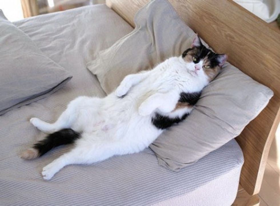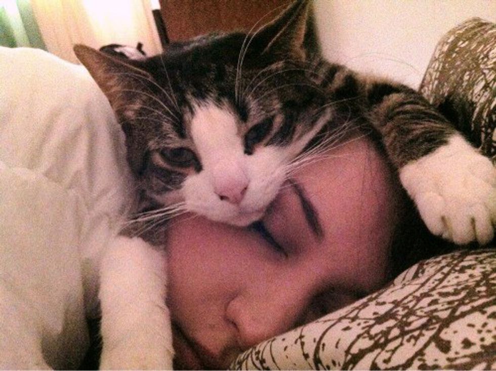 This kitty climbs into bed with you but instead of laying at a normal spot near your feet, they decide they want more. They will walk right up next to you and sleep against the pillow on the other side of the bed. May God help you if you accidentally roll onto their new territory and wake them.