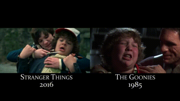 These beams of light, centers of comic relief, and all around adorable nuggets are the glue that hold both cinematic masterpieces together. Where Chunk has the Truffle Shuffle, Dustin has his cleidocranial dysplasia, aka toothless disease. Both have a love for food, as Dustin's survival materials featured all snacks, and his quest for chocolate pudding rivals Chunk's love for a hot piece of pizza.
