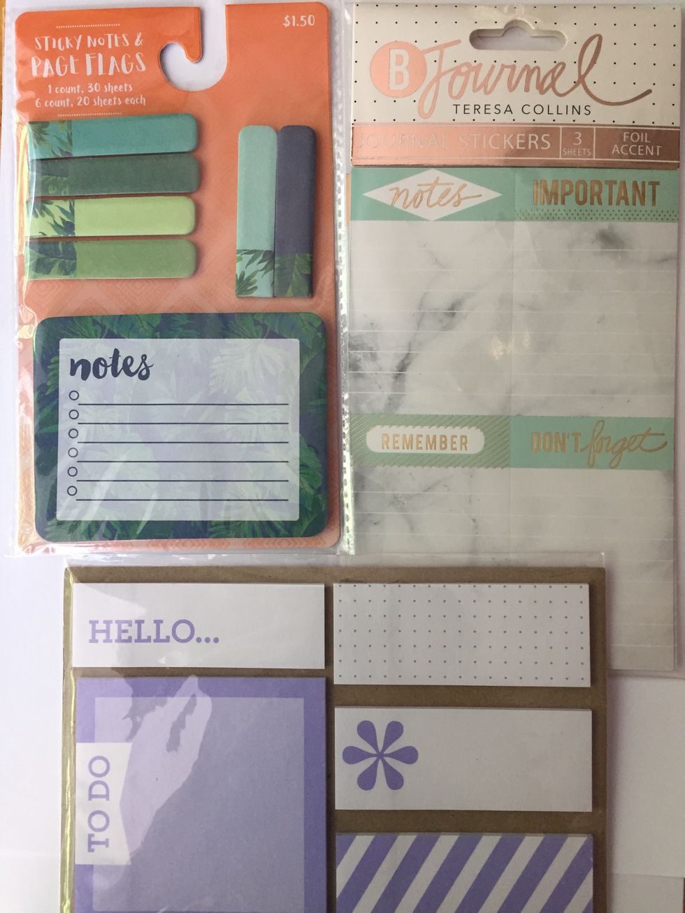 Sticky notes help me to block off sections in my planner and to make separate lists. They come in every shape and size you could imagine, and of course fun colors. Mine are once again from Joann's.
