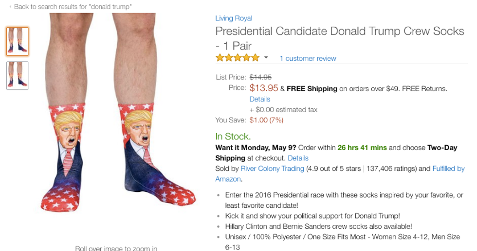 It doesn't specifically say "Trump" on it, but it comes up in the search results when you look up "Donald Trump" on Amazon.