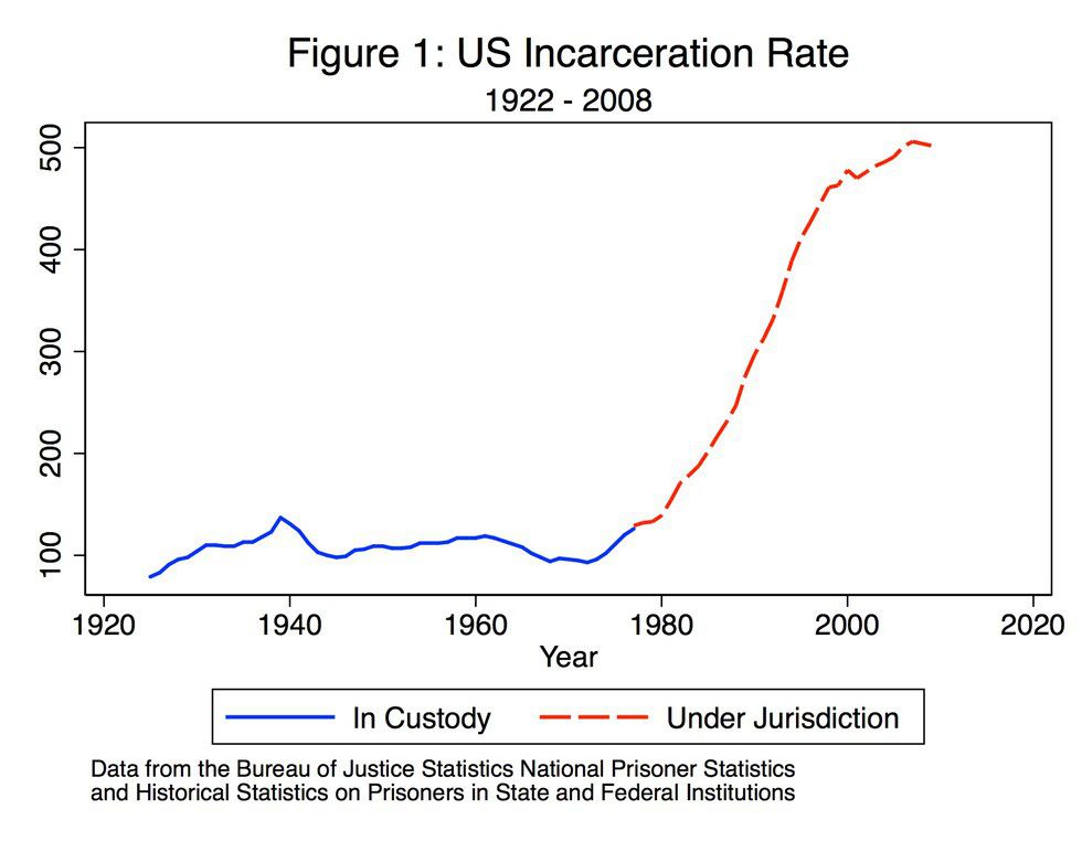 Since 1980, our prison population has nearly quintupled, but I guess that's just a system on being "hard on crime," right? Maybe we caught up to crime. Maybe there just has been more crime since 1980, right? There seems to be a mass shooting every week, and, whenever you put on the 10 o'clock, there always seems to be so much crime.