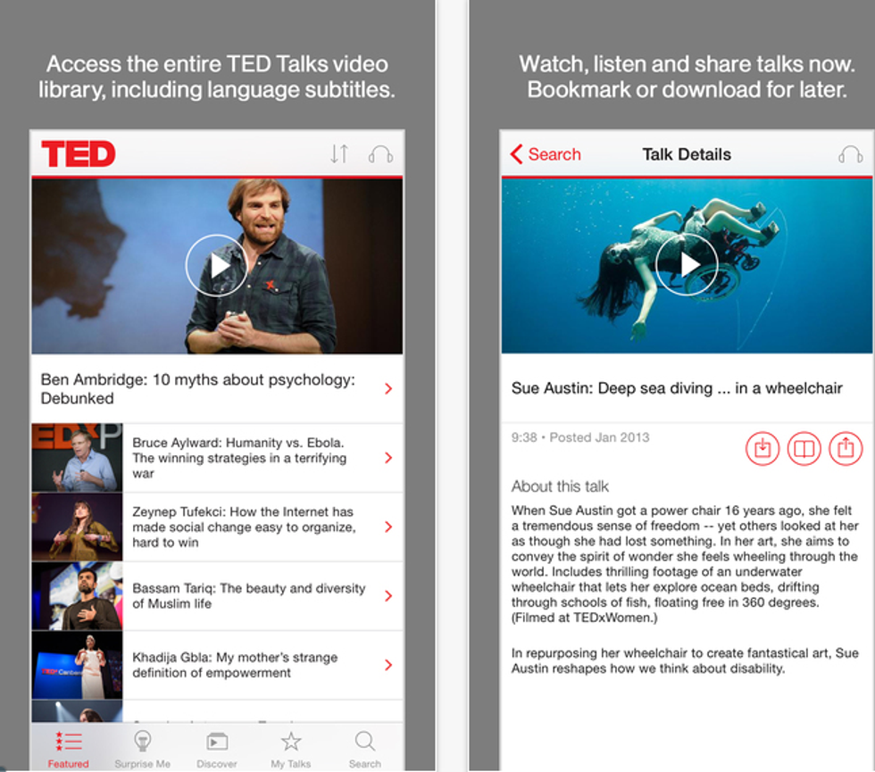 Watch or listen to the entire TED Talks library, which includes informational and entertaining videos of shared perspectives from a variety of people with different backgrounds and cultures who provide a deeper understanding of our world.