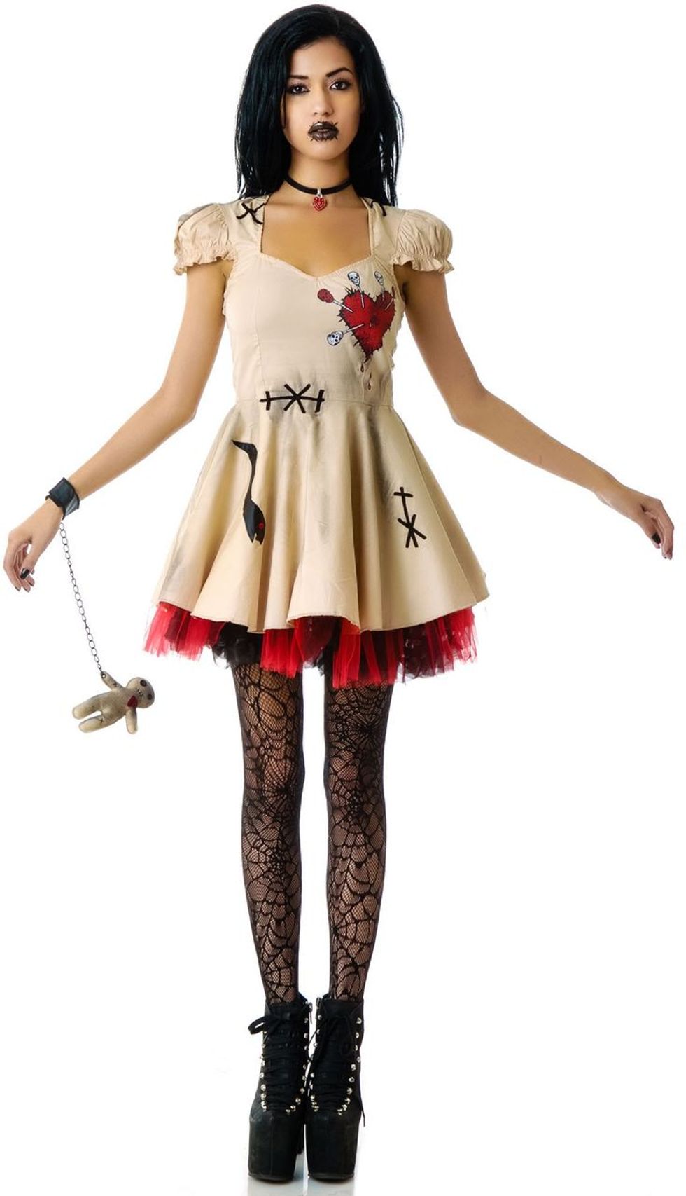 This one is all about the makeup. Pick any dress you own, tights, black boots and some amazingly creepy makeup. Just use the stitch design all over your face, and dress to transform yourself into a human pincushion.