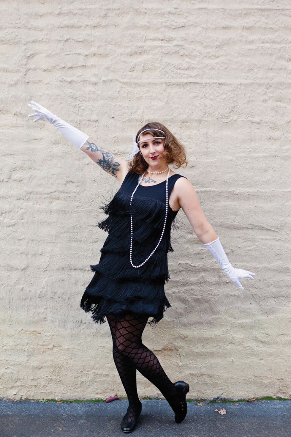 This costume is absolutely timeless. All you need is a black fringe dress that reveals your knees, fishnet stockings, black heels or flats, a unique headband and pearls. This look is very versatile and extravagant. Your makeup is a mix of dark lips, powdery cheeks and sleek eyebrows. Your hair can be a straight bob or bouncy curls. Make this look your own!